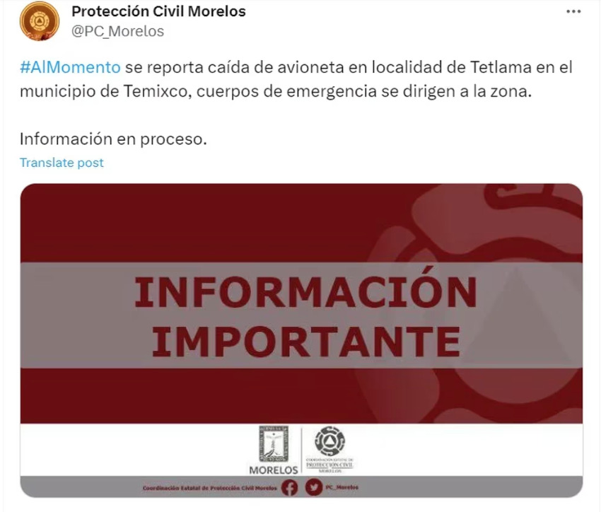 Protección Civil de Morelos, a través de la red social X (antes Twitter), informó sobre los hechos. Además, en una grabación en redes sociales fue compartido un breve video en el que pobladores hablan sobre la avioneta, incluso mencionan una explosión en la zona.