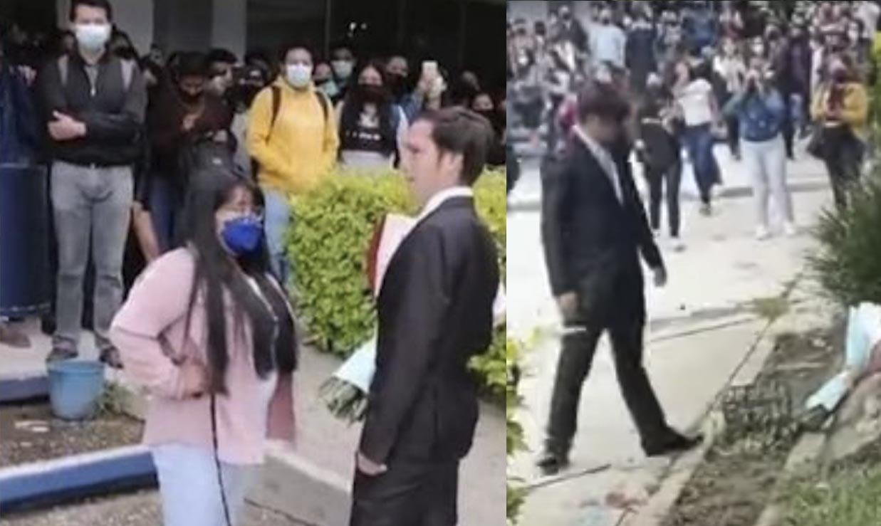 En las imágenes del video difundido, se observa el momento en el que «el soldado caído», como lo han bautizado en redes sociales, tira el ramo de rosas en una jardinera de la universidad tras el rechazo de la joven.