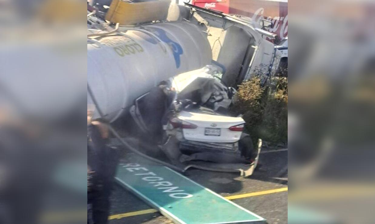 Por lo cual fue impactado violentamente en segundo por uno de sus costados, lo que a su vez provocó que el conductor de la pipa perdiera el control de su tractocamión volcando a la orilla de la carretera.