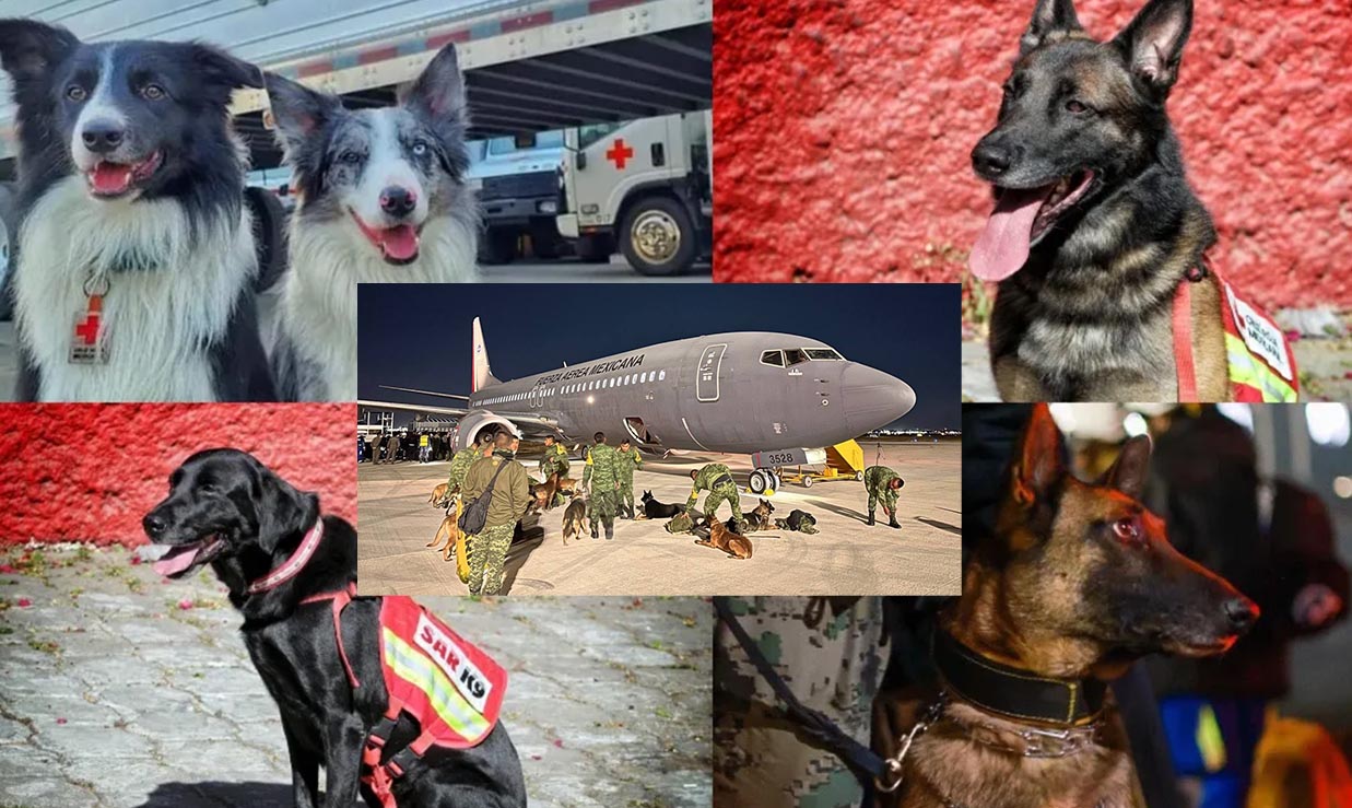 Junto con la delegación mexicana de especialistas de la Secretaría de la Defensa Nacional (Sedena), de la Secretaría de Marina (Semar), y de la Cruz Roja, viajan un grupo de 16 valerosos perros rescatistas para que ayuden a buscar a las personas que se encuentran bajo escombros.