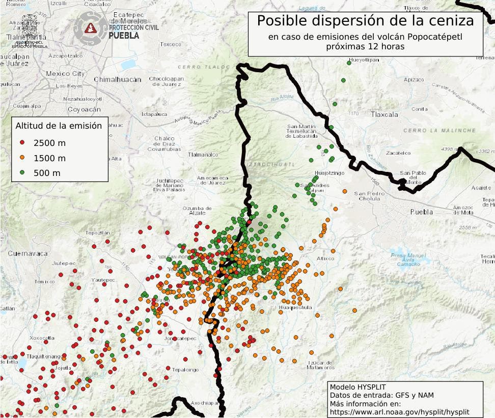 La dependencia local añadió que la ceniza podría dirigirse hacia los municipios de San Andrés Calpan, San Nicolás de los Ranchos, Tianguismanalco, Atlixco, Tochimilco, Huaquechula, Atzitzihuacán y Tepexco.