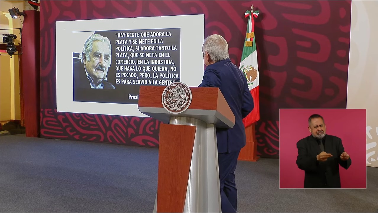 Pidió a sus colaboradores proyectar un video del ex mandatario uruguayo, donde expone algunas de sus ideas; además de la frase a la que aludió, en la cual Mujica planteaba: “Hay gente que adora la plata y se mete en la política, si adora tanto la plata que s meta en el comercio, en la industria, que haga lo que quiera, no es pecado, pero la política es para servir a la gente”.