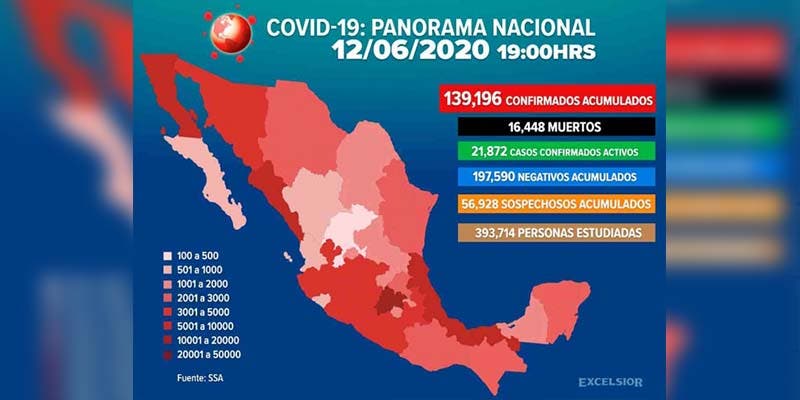 Ya son 139 mil 196 casos positivos de Covid-19 en México.- Autoridades de la Secretaría de Salud federal informaron que los casos positivos de Covid-19 ya son 139 mil 196 en México.