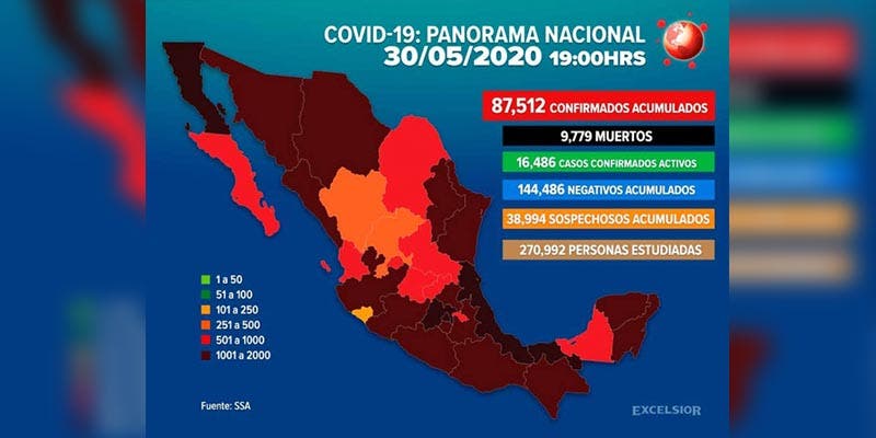 Ya son 87 mil 512 los casos de coronavirus en México.- Autoridades de la Secretaría de Salud, informaron que el número de casos positivos de coronavirus incrementó a 87 mil 512 en México.