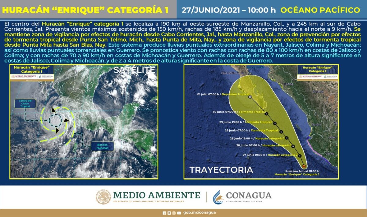 México Clima: ‘Enrique’ podría convertirse en huracán categoría II este domingo Durante este domingo, el huracán “Enrique” podría alcanzar la categoría II, informó el Servicio Meteorológico Nacional (SMN). El evento ciclónico se encuentra a 280... Turquesa Newsdomingo, 27 de junio, 2021