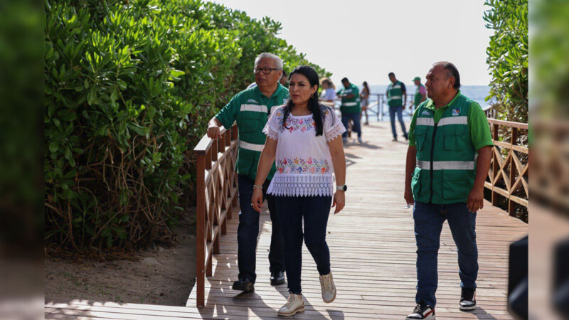 La presidenta municipal, Blanca Merari Tziu Muñoz, supervisó los trabajos de mantenimiento integral en los accesos a playas públicas “5 Arrecifes” y “6 Casita...