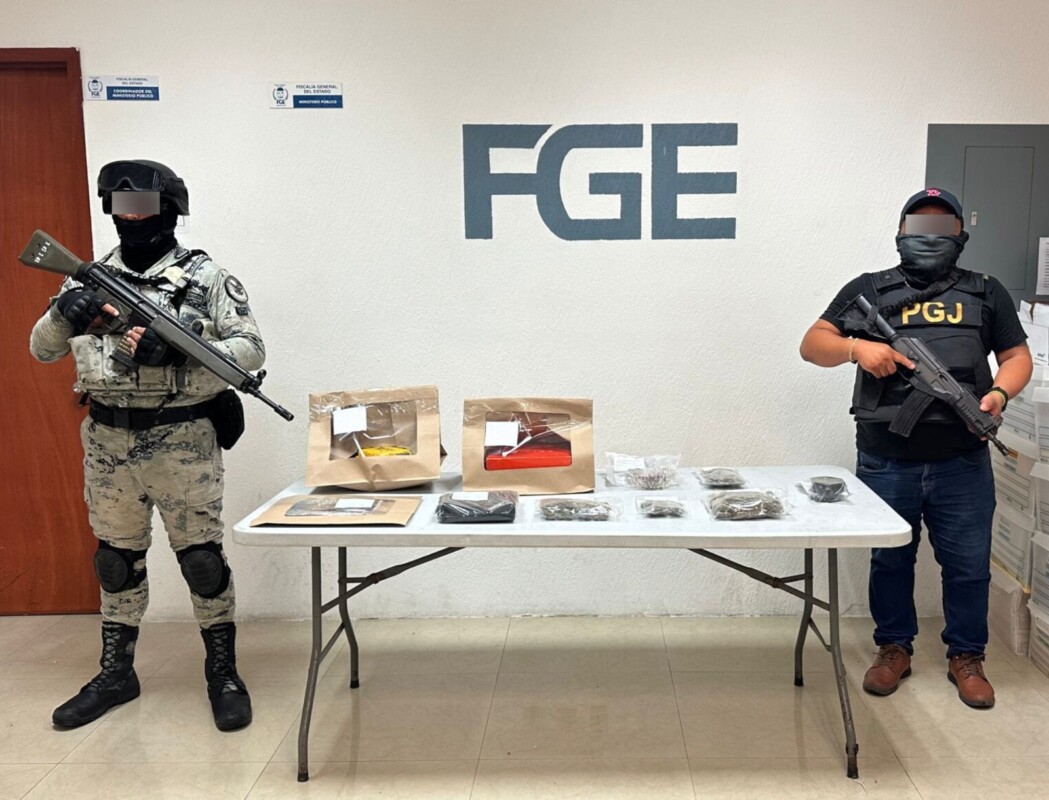 La Fiscalía General del Estado, en colaboración con la Guardia Nacional, dio cumplimiento a una orden de cateo girada por un juez de Control en Playa del Carmen, en el que aseguraron dosis de presuntos estupefacientes y un vehículo.