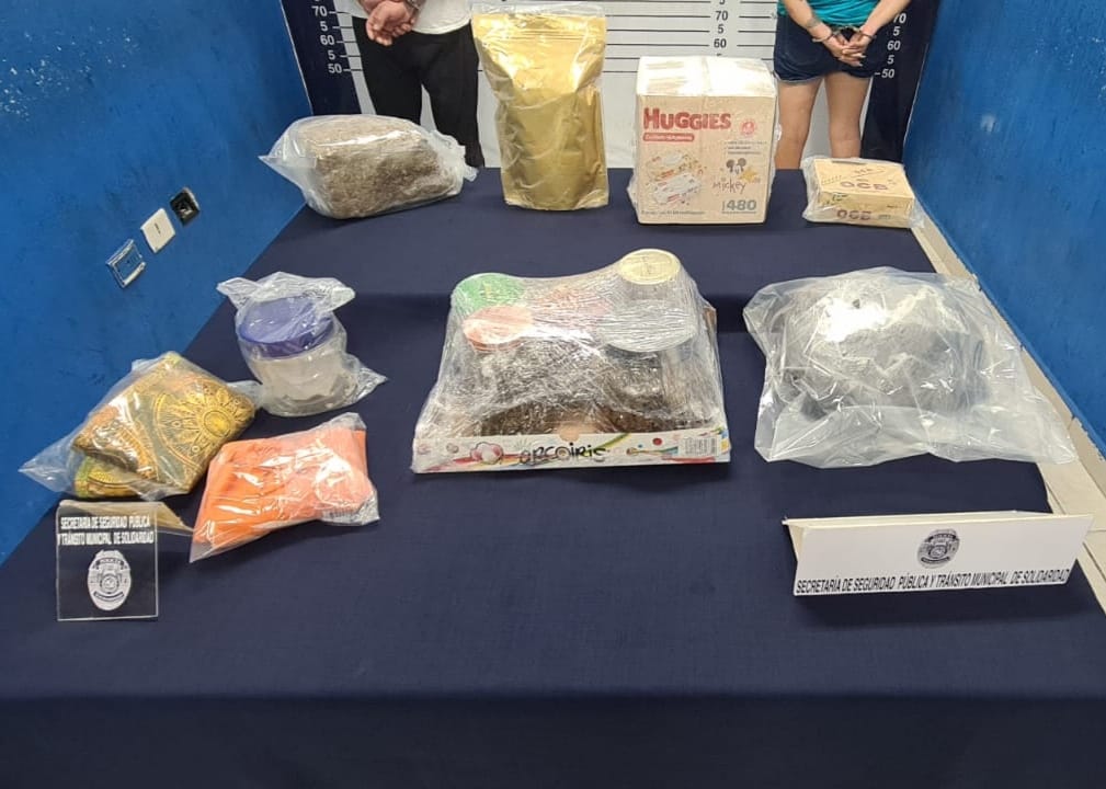 En un boletín emitido esta tarde de martes 13 de septiembre, la Secretaría de Seguridad Pública y Tránsito Municipal de Solidaridad (SSpyTMS) informa sobre este inusual hecho, señalando que a la pareja les fue decomisada una considerable cantidad de estupefacientes.