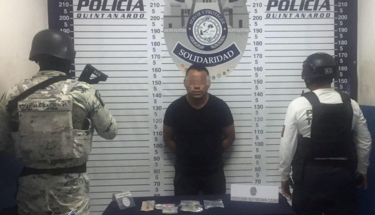 En una rápida reacción, elementos de la Policía Turística de la Secretaría de Seguridad Pública y Tránsito Municipal de Solidaridad y la Guardia Nacional, aseguraron a un sujeto en posesión de un cartucho y posibles narcóticos como marihuana, cocaína, “piedra” y cristal en la Quinta Avenida.