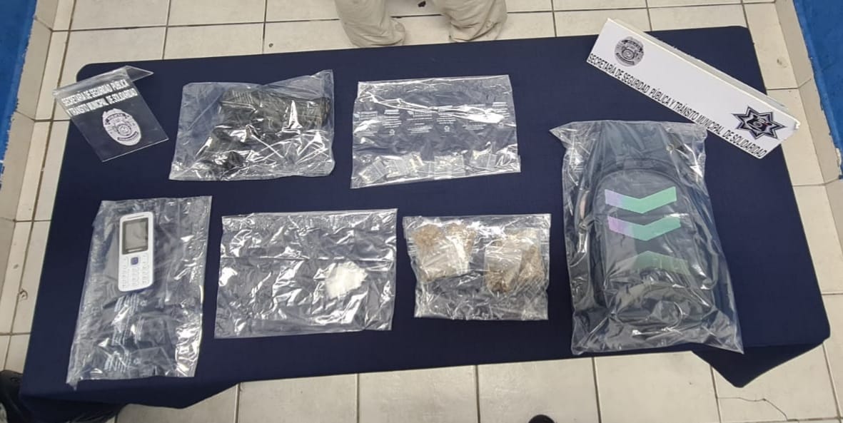 El presunto, fue asegurado sobre la avenida Pavorreal, y tras una inspección de seguridad le encontraron una réplica de arma de fuego, 6 bolsitas con posible marihuana, 7 bolsitas con una sustancia similar a la droga cristal y 8 bolsitas con lo que parece ser la droga conocida como crack.