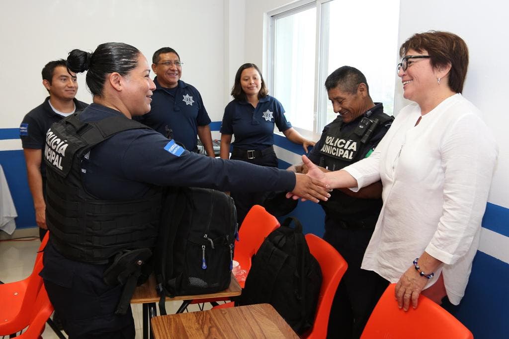 La presidenta municipal Laura Beristain, entregó constancias a elementos de la Dirección General de Seguridad Pública y Tránsito que encabeza el encargado del despacho, Martín Estrada Sánchez por su participación en el curso “La ética en las relaciones humanas, equidad de género”, impartido por psicólogos expertos del DIF (Sistema Nacional para el Desarrollo Integral de la Familia) Solidaridad.