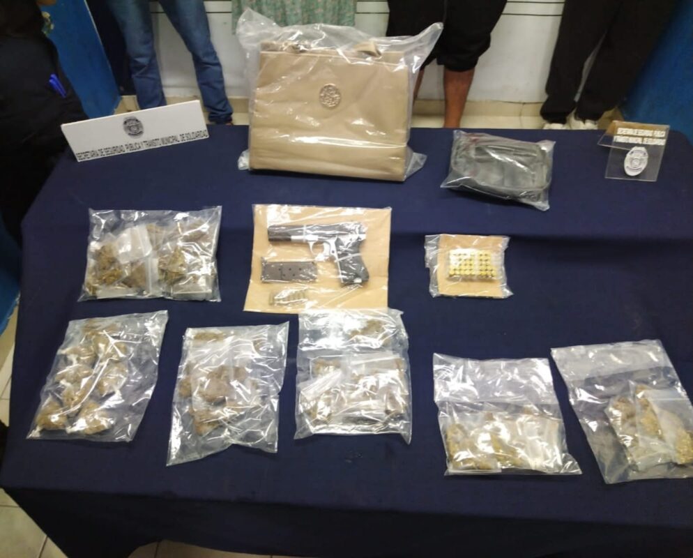 Lo que permitió el aseguramiento en la calle 30 entre las avenidas 10 y Quinta de la colonia Centro, de un grupo de cuatro personas, así como un arma de fuego, varios cartuchos útiles y varias bolsitas con posible marihuana.