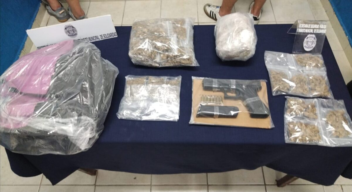 Dos personas fueron detenidas esta tarde en el municipio de Solidaridad (Playa Del Carmen), cuando tras una revisión se les encontró en posesión de un arma de fuego y varias bolsas con la presunta droga denominada mariguana.