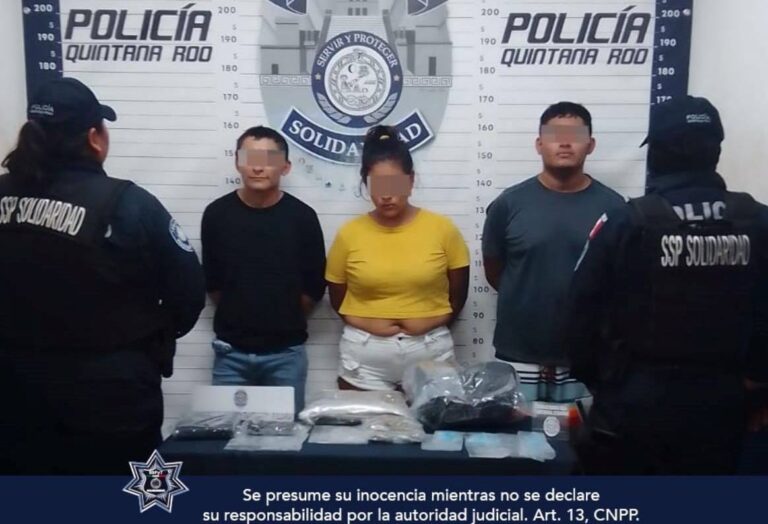 Asimismo, fueron asegurados Freddy «N», de 38 años de edad, originario de Yucatán; Samuel «N», de 21 años de edad, procedente de Tabasco y Josefina «N», de 34 años, originaria de Guerrero, en posesión de 14 envoltorios con posible marihuana, 31 con lo que parece la droga llamada “piedra” y un arma de plástico, tras ser sorprendidos intercambiando los envoltorios en la avenida Calzada del Sol con cerrada Cazón de la alcaldía de Puerto Aventuras.