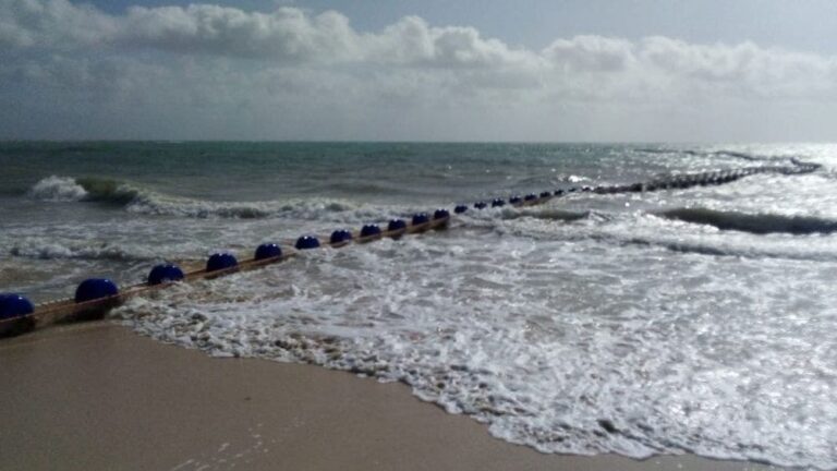 Continúa Ocean Cleaner instalación de barrera antisargazo.- Continúan los trabajos de la colocación de la barrera antisargazo, esta de color azul, por parte de la empresa canadiense Ocean Cleaner, que abarcará un total de 1200 metros.