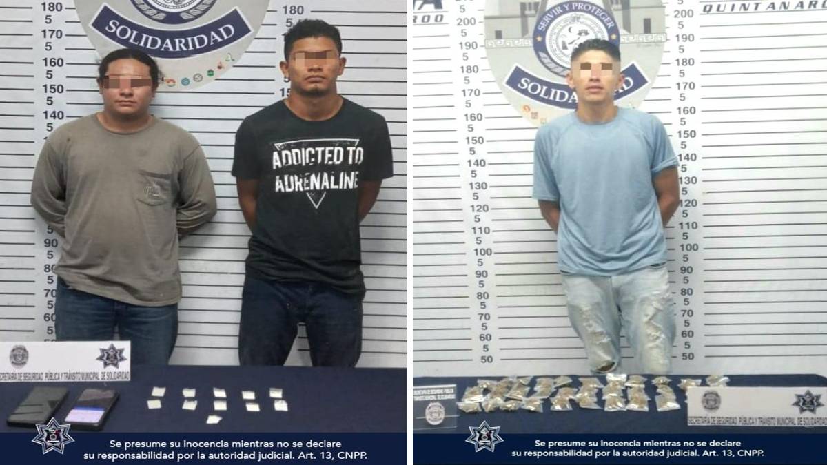 En dos hechos distintos, elementos de la Secretaría de Seguridad Pública y Tránsito Municipal de Solidaridad, aseguraron a tres sujetos en posesión de posibles narcóticos.