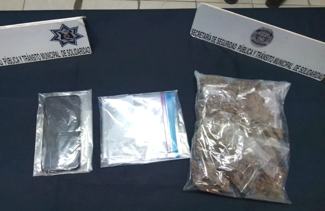 Policías de la Secretaría de Seguridad Pública y Tránsito Municipal de Solidaridad, aseguraron a dos personas en posesión de lo que parece marihuana, cuando realizaban rondines de vigilancia en la colonia Centro de Playa del Carmen.