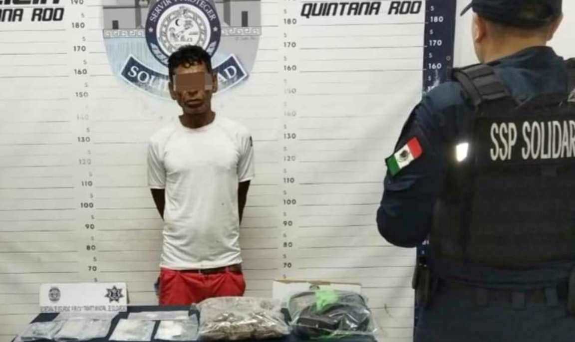 Durante la implementación de un operativo de seguridad y vigilancia en la colonia Ejido de Playa del Carmen, Policías Municipales de Solidaridad aseguraron a un sujeto y más de 160 envoltorios con posibles drogas como “piedra”, cristal y marihuana.