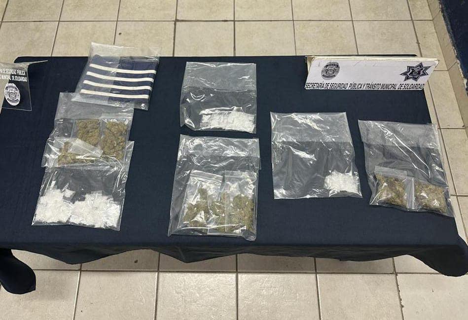 Asimismo, durante los recorridos de proximidad y prevención fue asegurado Jorge «N», de 46 años de edad, originario de Veracruz, en posesión de 5 paquetes y 3 envoltorios con posible marihuana, así como un paquete con posible metanfetamina, tras ser sorprendido junto a una motoneta Italika sacando de entre sus ropas y el vehículo los posibles narcóticos en la colonia Cruz de los Servicios.