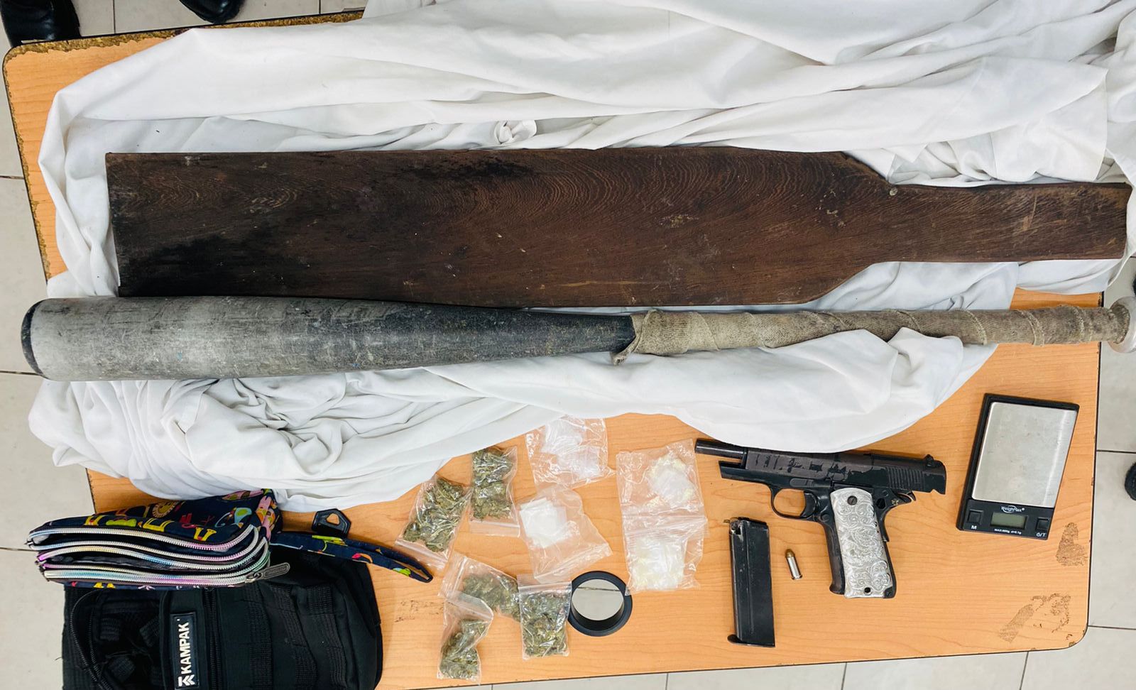 Al realizar una inspección de seguridad a Mateo «N» tenía en su posesión un arma de fuego, tipo escuadra, mientras que Yesi «N» tenía entre sus pertenencias 5 bolsas con vegetal verde similar a la marihuana, 5 bolsas con una sustancia cristalina de las características de la droga llamada cristal, 9 bolas con polvo blanco al parecer cocaína y 25 bolsas con una sustancia sólida de como la droga llamada piedra.