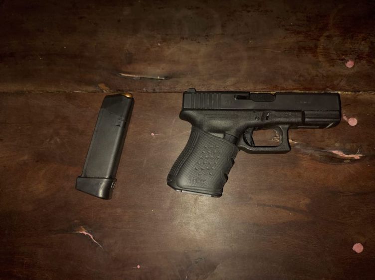 Al realizar una revisión de seguridad, a uno de los sujetos, de 27 años de edad, se le encontró entre su ropa un arma de fuego marca Glock modelo 25 calibre .380 acp, con 16 cartuchos útiles, la cual portaba a la altura de la cintura.
