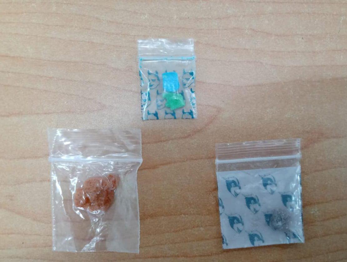 Entre las pertenencias de los asegurados los policías encontraron nueve bolsas con una sustancia granulada de las características de la droga llamada “cristal”, una bolsa con dos pastillas similares a la droga conocida como éxtasis y una bolsa con polvo blanco al parecer cocaína.