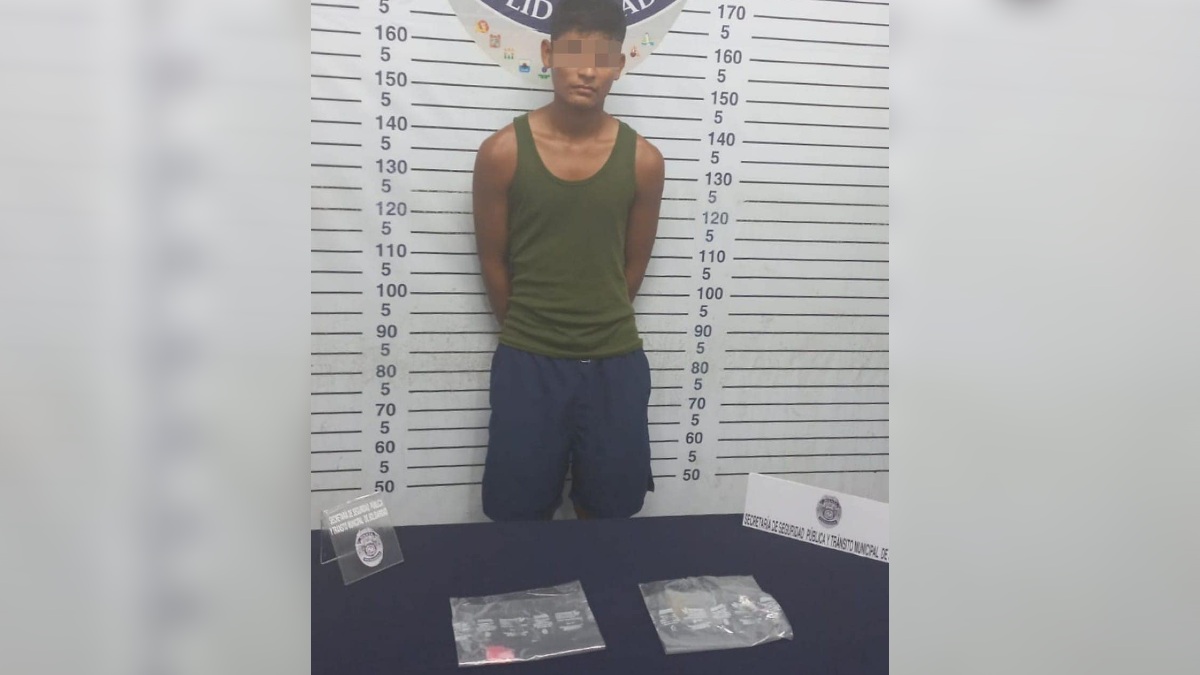 Ángel «N», de 19 años de edad, originario de Veracruz, fue detenido la tarde del 28 de julio cuando los policías de la Secretaría de Seguridad Pública y Tránsito Municipal de Solidaridad transitaban por la calle Cedro con avenida Eje del Equilibrio, y lo sorprendieron manipulando una bolsita con posible marihuana.