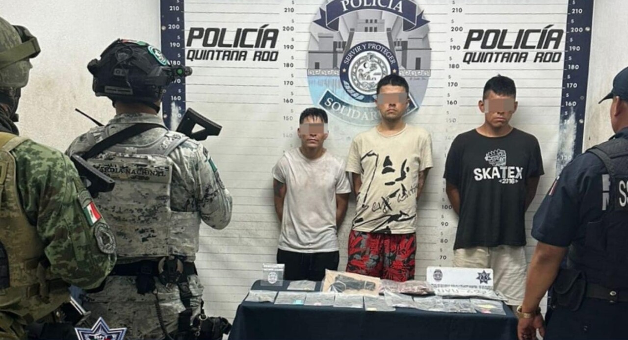 Detienen a tres narcodistribuidores en la colonia Centro de Playa del Carmen; les decomisaron un arma de fuego y 30 dosis de diversos enervantes.