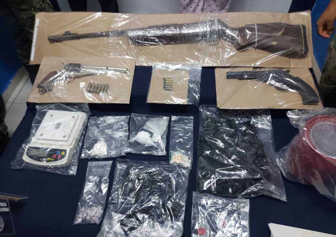 Así como una bolsa y 14 bolsitas con posible cocaína, 20 bolsitas con la posible droga llamada piedra, 8 bolsitas con probable droga LSD, además de un arma larga tipo escopeta, cartuchos útiles calibre .22, una réplica de arma de fuego tipo revolver y una báscula gramera.