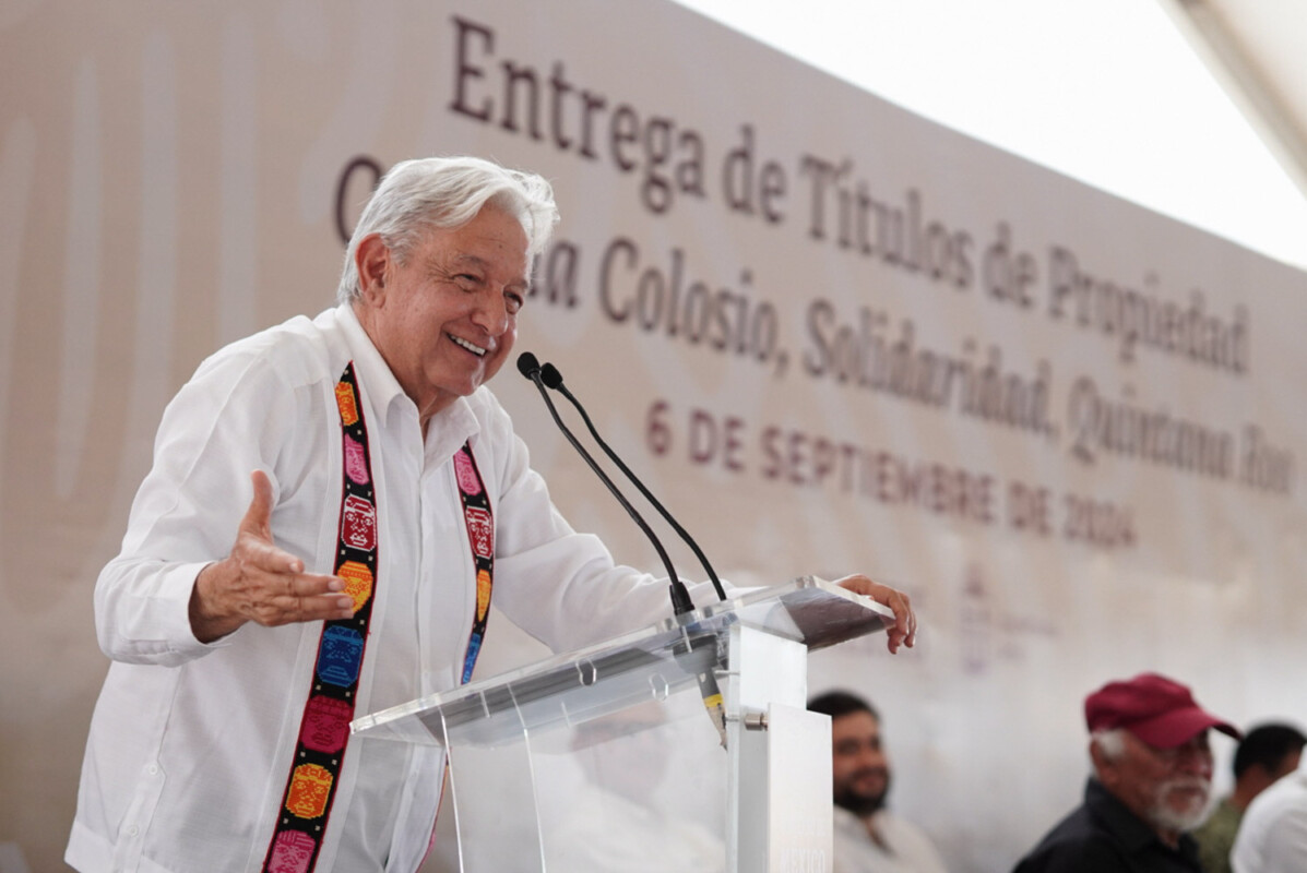 El presidente Andrés Manuel López Obrador entregó títulos de propiedad a habitantes de la colonia Colosio en el municipio de Solidaridad, de Quintana Roo.
