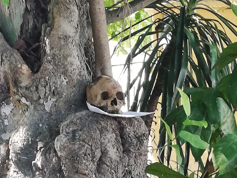 Playa del Carmen, Quintana Roo.- Al mediodía de este miércoles hallan un cráneo humano que fue dejado en el tronco de un árbol con un mensaje supuestamente intimidatorio debajo.