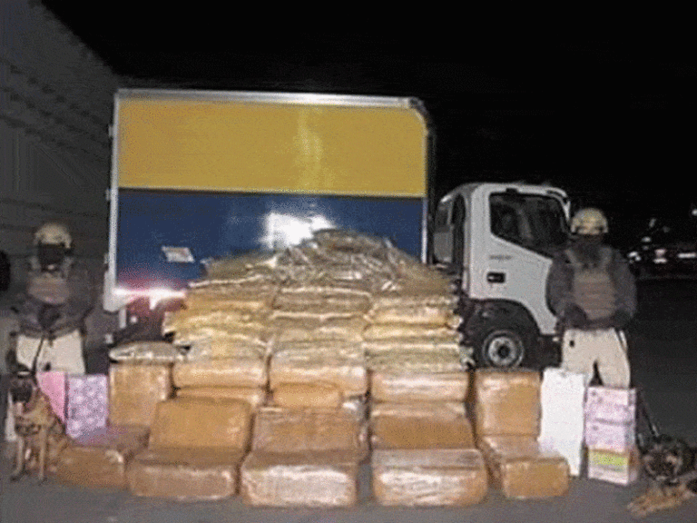 Los policías procedieron a la inspección del camión de tres toneladas con caja cerrada, encontrando 100 cajas de zapatos; sin embargo, al proseguir con la revisión del vehículo en el fondo y cubierto con una sábana hallaron 19 tabiques de marihuana con un peso aproximado de entre 15 y 18 kilos y102 bolsas de nylon con cannabis, con un peso estimado de 2 kilos cada una, de ahí que el peso total se calcule en aproximadamente 500 kilos.
