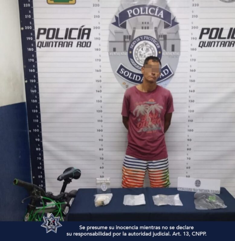 Luego, en otro punto de la ciudad, en calle 104 entre 35 y 40, Reynaldo «N» de 29 años de edad, procedente de Chiapas, fue asegurado en posesión de un envoltorio con posible marihuana y cinco envoltorios con lo que parece la droga llamada piedra.