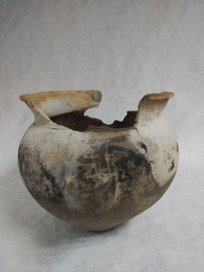 De acuerdo con los expertos, la olla conserva sus dos asas opuestas y presenta una decoración con motivos geométricos pintados en color negro; no obstante, tiene faltantes en su parte superior, a la altura de su cuello y borde.