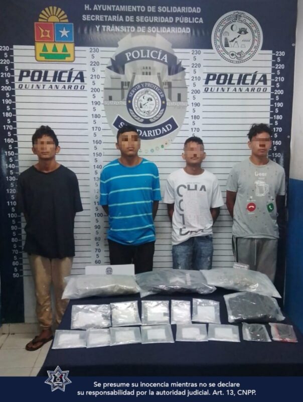 En la primer acción policiaca, los oficiales de la Secretaría de Seguridad Pública y Tránsito Municipal de Solidaridad (SSPyTMS) detuvieron a 4 sujetos del sexo masculino cuando implementaban labores de vigilancia y proximidad social en el fraccionamiento Villas del Sol.