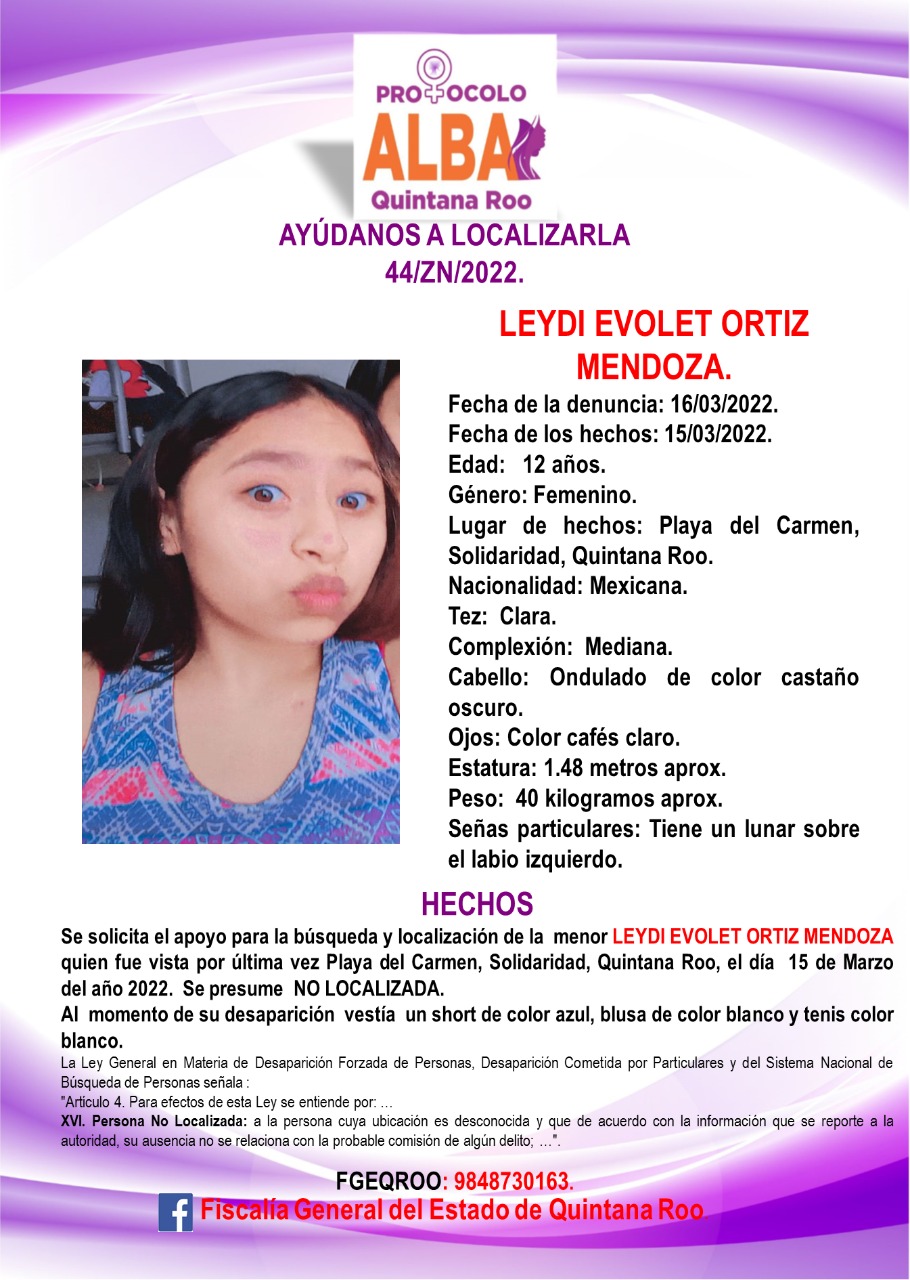 La primer adolescente responde al nombre de Leydi Evolet Ortiz Mendoza, tiene apenas 12 años y fue vista por ultima vez el 15 de marzo en Playa Del Carmen, según la ficha difundida por la FGE.