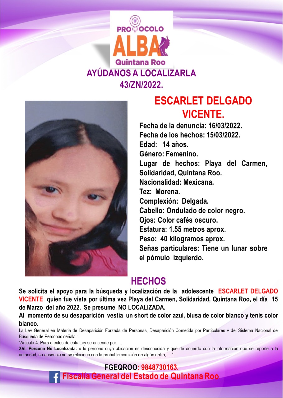 En tanto que la segunda menor responde al nombre de Escarlet Delgado Vicente, de 14 años, también fue vista por ultima vez el día 15 de marzo en Playa Del Carmen, y al momento de su desaparición vestía short azul, blusa blanca y tenis también color blanco.