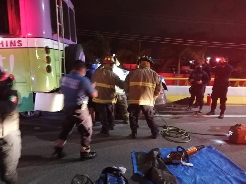 Rescatan a conductor prensado tras choque en Playa del Carmen; los hechos ocurrieron sobre uno de los puentes vehiculares.