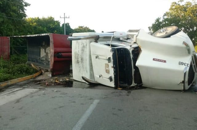 Un trailer se volcó esta mañana en la carretera Playa del Carmen-Cancún presuntamente por imprudencia de una van turística.