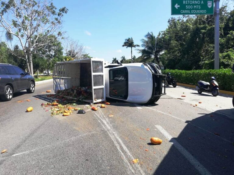 Una unidad de transporte de frutas que circulaba sobre el Boulevard Playa del Carmen se volcó tras evitar una colisión con una pipa y colisionar con un transporte turístico, dejando un saldo de un lesionado de gravedad, quien es atendido en el Hospital General de esta ciudad.