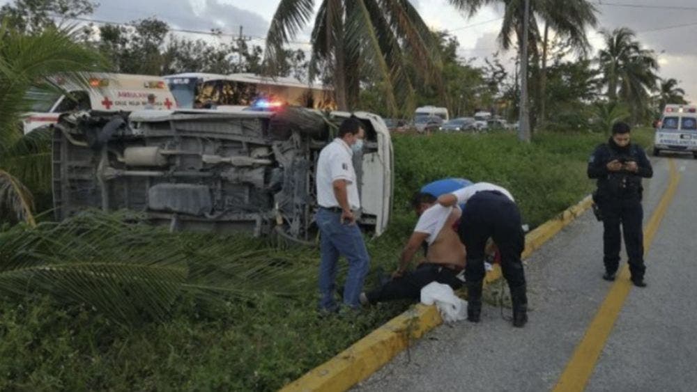 El exceso de velocidad con el que suelen conducir los transportistas foráneos de la ruta Cancún-Playa Del Carmen, provocó la volcadura de una van que dejó al menos una docena de lesionados.