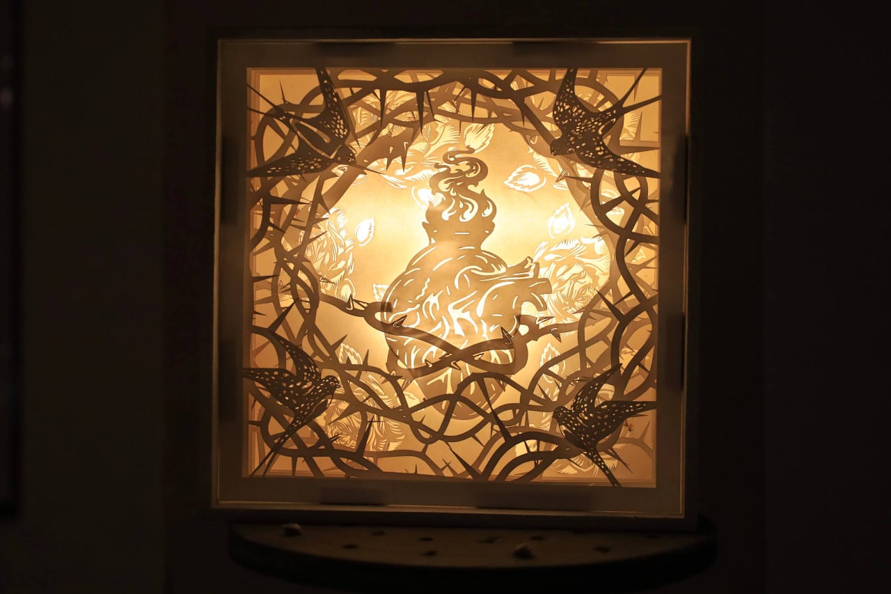 Por su parte, Daniel Valle, originario de Guadalajara, Jal., quien también lleva dos años en la Riviera Maya, dijo que sus trabajos reflejan reflexiones sobre distintos aspectos de la vida. Sus obras, entre las cuales hay móviles y pantallas de lámparas, son elaboradas principalmente con papel y cartón.