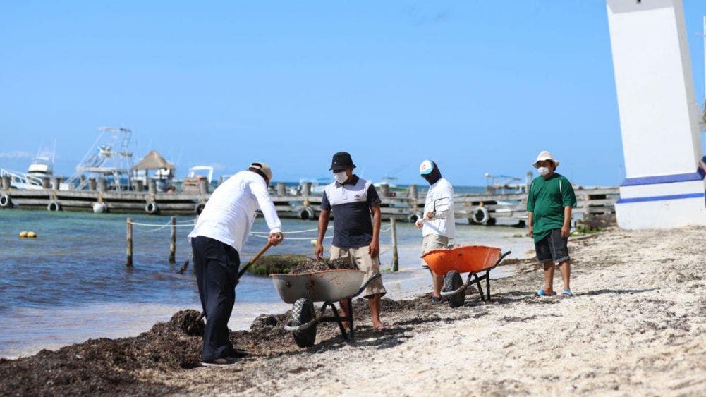 Atiende Laura Fernández arribo de sargazo a Puerto Morelos, con una cuadrilla de trabajadores que todos los días retiran la macroalga