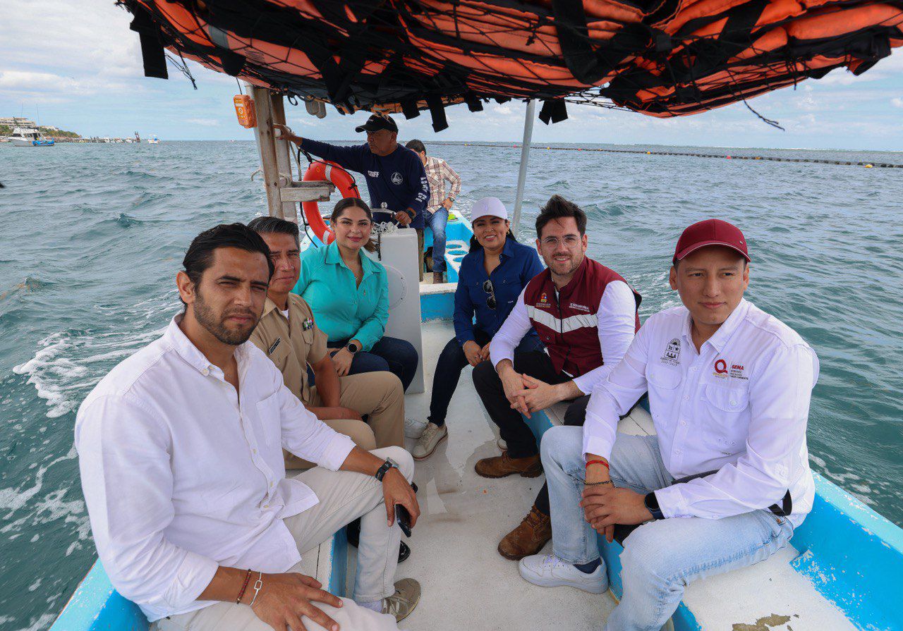 La presidenta municipal, Blanca Merari Tziu Muñoz, encabezó un recorrido de supervisión junto al titular de la Secretaría de Ecología y Medio Ambiente (SEMA), Óscar Rébora Aguilera, para constatar la funcionalidad de los 2.2 kilómetros de barrera antisargazo instalados desde el muelle fiscal de Puerto Morelos hasta el hotel The Fives.