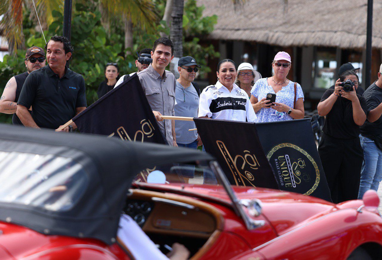 La presidenta municipal Blanca Merari Tziu Muñoz dio hoy el banderazo de salida a los 30 autos, modelos de los años 50, 60 y 70, participantes en el Unique Rally Clásico, que emprendieron desde la Ventana al Mar del Casco Antiguo un recorrido de 600 km por carreteras de Quintana Roo y Yucatán.