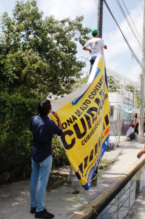 Recordó que estas lonas también están colgadas en los accesos a las playas de Puerto Morelos y en diversos puntos de todo el municipio, entre ellos la comunidad de Leona Vicario, en los que se registra alta concentración de personas.