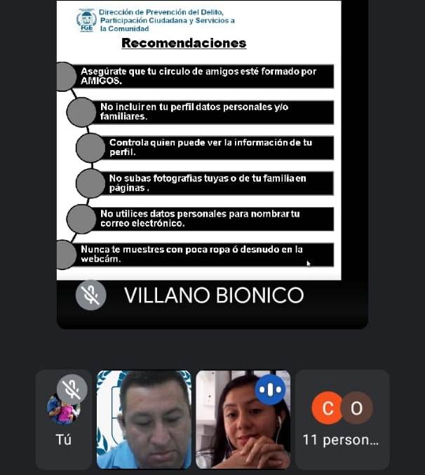 Por tal motivo, Ma. Soledad Foyo dijo que se impartió una plática en la que se hizo hincapié que al utilizar redes sociales no se deben incluir datos personales o familiares, que el círculo de amigos esté conformado efectivamente por amigos, controlar quién puede ver la información, no subir fotografías con ubicación y jamás subir imágenes con poca ropa o de desnudos