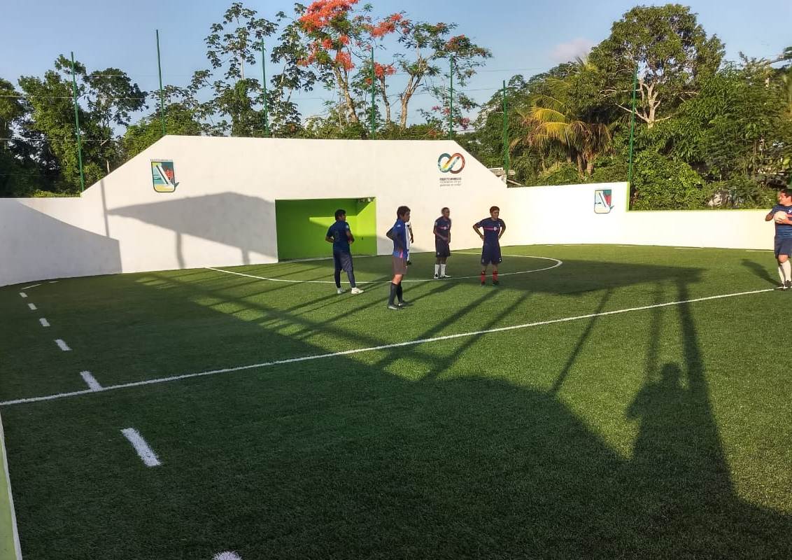 Con el objetivo de promover la activación física y la práctica del deporte, el gobierno de Puerto Morelos llevó a cabo la rehabilitación integral de la cancha de futbol rápido de esta comunidad, que cuenta con nuevo pasto sintético, malla, redes, pintura y más iluminación.