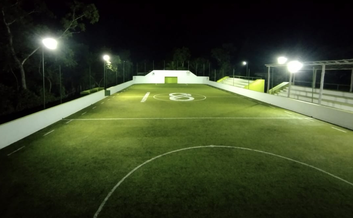 Con el objetivo de promover la activación física y la práctica del deporte, el gobierno de Puerto Morelos llevó a cabo la rehabilitación integral de la cancha de futbol rápido de esta comunidad, que cuenta con nuevo pasto sintético, malla, redes, pintura y más iluminación.