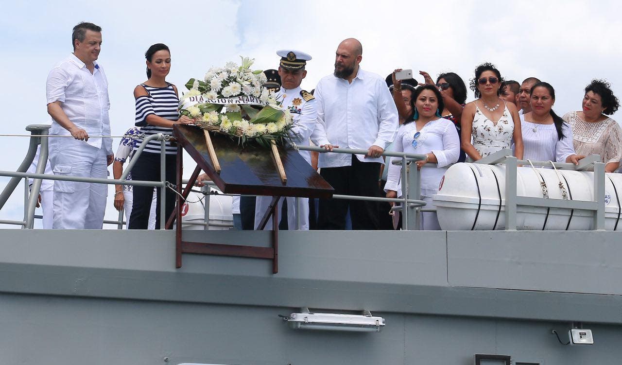Luego de la ceremonia cívica en la que realizaron honores a la bandera y se entonaron los himnos a Quintana Roo y Nacional Mexicano, las autoridades encabezadas por Laura Fernández se trasladaron a altamar a bordo del buque Uxmal con el objetivo de depositar una ofrenda floral en memoria de los marinos mexicanos caídos en cumplimiento de su deber.